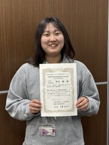 | 表彰された博士前期課程2年生の寺内瞳さんと優秀発表賞賞状 | ||