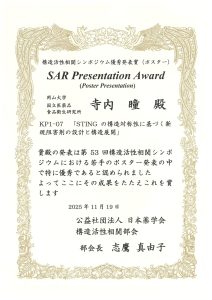 令和7年9月4日~ 5日に第53回構造活性相関シンポジウムが大阪府東大阪市で開催されました。博士前期課程2年生の寺内瞳さん(生物有機化学分野)がポスター発表を行い、優秀発表賞を受賞しました。